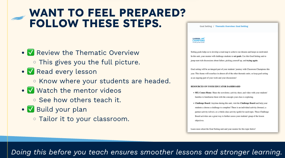 - After reading the thematic overview, we recommend reading through all of the lessons, watching the mentor videos, and creating a plan for how you will teach all of the lessons.Doing this work BEFORE you teach the unit will set you up for success when you go to teach the unit.