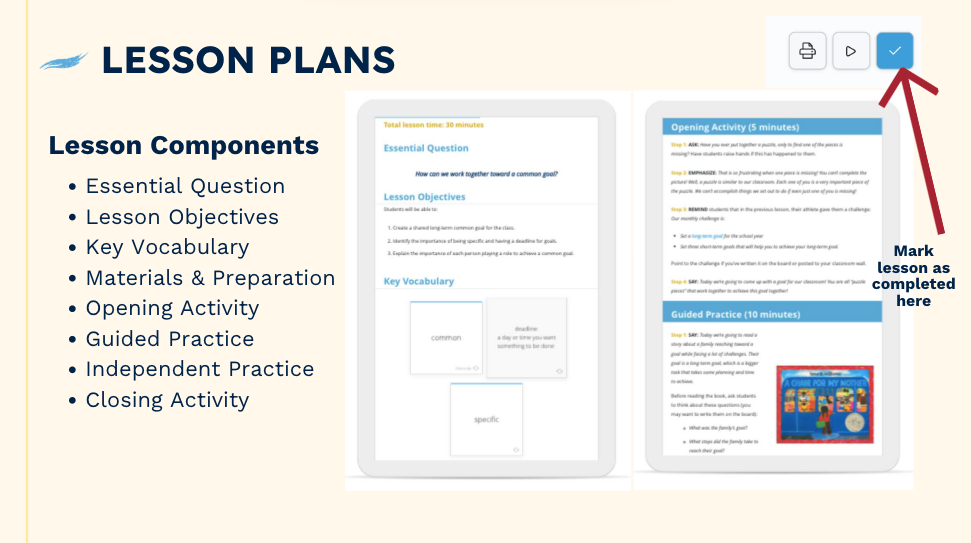 To keep your lessons organized, we recommend marking your lessons completed by clicking the checkmark next to each lesson.